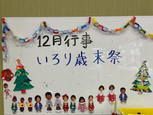 12月はクリスマスや大掃除、餅つき、忘年会、新年の準備などたくさん行事がありますね!いろりも年末に向けて壁画作りなど製作に熱が入ります。今週は12月の行事として歳末祭を予定しています。17日~19日迄、ボランティアの方や紅白仮装歌合戦、ガラポン抽選など盛りだくさんです。2025年を皆さんで締めくくり盛り上がりましょう!